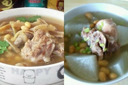 白萝卜用来保汤也是很好的材料,味道鲜美而且可以下火。猪骨洗净并用热水出一出水。白萝卜去皮切块。新鲜黄豆洗净。取出汤锅,注入清水。待水煮开后把猪骨和黄豆先放下去中小火炖1个半小时。接着也把白萝卜放进去,再炖1个小时。然后就放入调味料,少许的盐巴,酒料。此汤不宜放得过咸,有下火之功效,一家大人都可以饮用。
