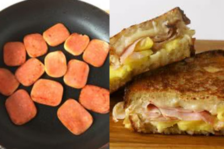 最后,把煎好的午餐肉放在切片吐司上,利用午餐肉的温度。马上放入芝士片,使其慢慢地融解。在上面逐一加上沙拉酱、黄瓜片、火腿片,再加上一片吐司面包就可以吃了。【女物原创未经允许,谢绝转载!】
