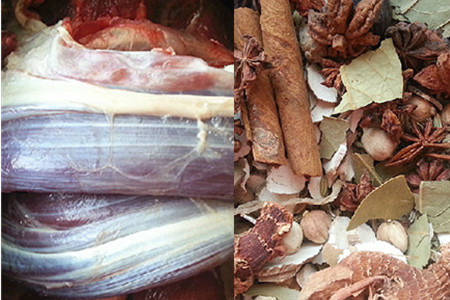 一、食材准备。牛腱子肉五斤,香料有八角、桂皮、香叶、花椒,您还可以加入草果、白芷、小茴香,调料有老抽和盐。