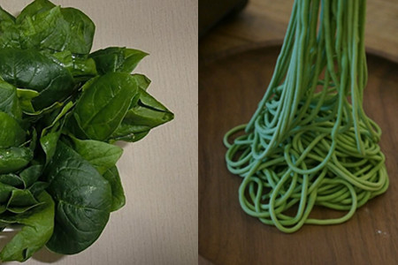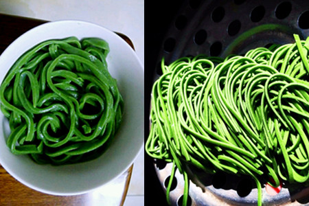 取同等份量的面粉与菠菜粉,将菠菜粉倒入面盆中,添加了菠菜粉的面粉呈碧绿色,看着就很有食欲,尤其夏天,颜色看上去很清爽。鸡蛋打散,加入精盐、味精等调味品,将面粉搅拌均匀后倒入清水,一边倒水一遍接着搅拌,然后将面粉和成光洁的面团。在面板上铺层薄面,将面团用面棍擀成一毫米左右的大面片,再切成五毫米左右宽度的细面条。
