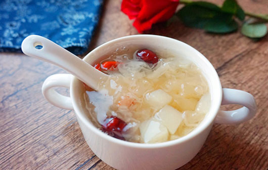 然后,将泡开的银耳放到煲中加入适量的水,水煮开后用小火煮40分钟,再将雪梨和冰糖一同放入,直至梨煮透后便可起锅。