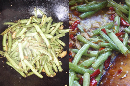 待它的表面变色之后,我们便可以将四季豆放入锅中翻炒,同时再加入事先准备好的干红辣椒,这样不仅可以炒出香味,同时还会让菜更加的香辣。