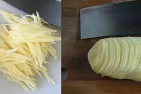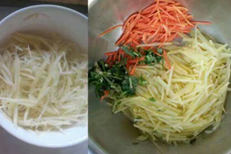 首先将土豆丝洗净去掉皮,然后用刀把土豆切成薄薄的片。片切好了之后我们要一片压一片的码起来。这里要注意的是土豆片一定要切得薄一点,这样切出来的丝也会更细。土豆丝切好了之后,我们要放在清水里浸泡20分钟。然后再用清水清洗2-3次去掉土豆丝上面的淀粉,这样炒出来的土豆丝才不会粘锅,也不会软软的。放在清水里也是为了防止它变色。