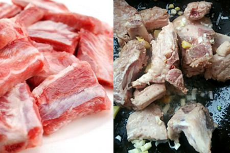 热锅起油,转成中火,倒入葱姜蒜一起爆香,香味溢出来之后放入排骨翻炒,添加少量的食盐、酱油、料酒等。
