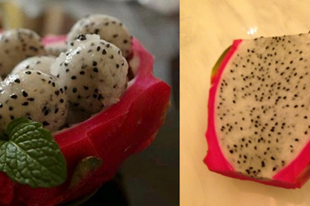 第三种做法是直接将火龙果切成两半,随意切开就行。然后用挖球器把火龙果的果肉挖出来。火龙果的皮也可以不用丢掉,直接用来做成火龙果肉小球的容器。