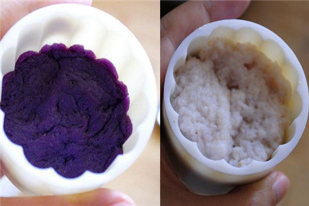 然后分别用两个容器装剥好皮的紫薯和白嫩嫩的山药,并且将它们分别碾压成泥状。