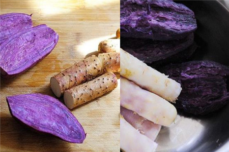 首先,我们将新鲜的紫薯和山药拿到锅炉里面蒸熟,然后再剥皮。注意先后顺序哦,这样皮剥的更容易。