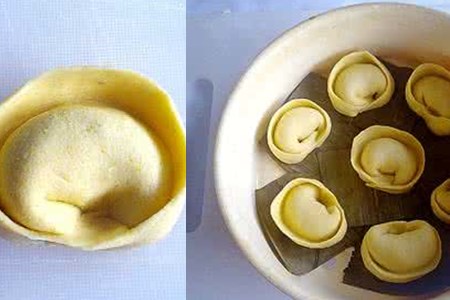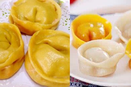 第一就是简单但重要的面皮的做法:适当的面粉,和蒸熟的南瓜搅拌成泥,再加上少量盐,将其揉成柔软光滑的面团,放置30分钟以上。然后将面团揉成长条,均匀切成多个小面团,擀成一张张圆形饺子皮,放在一旁。说到金元宝饺子的关键,其实就是南瓜泥,南瓜中富含丰富的胡箩卜素,把它加入到面团当中,就能让面皮变成漂亮的金黄色。