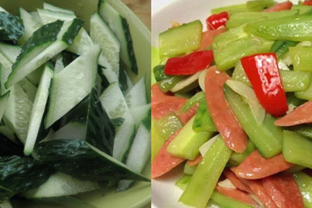然后将黄瓜和火腿放进去一起翻炒,用大火放进去翻炒大约5分钟,加入一些红辣椒。