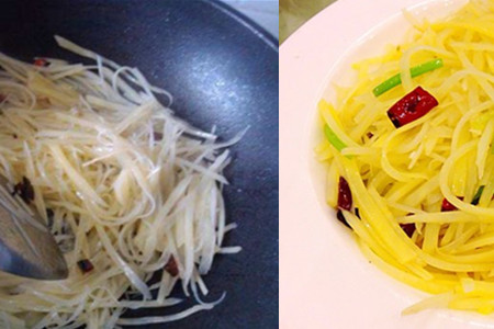 将土豆丝放进锅里面翻炒,加入泡椒水陈醋以及盐,将它们翻炒均匀就好了。