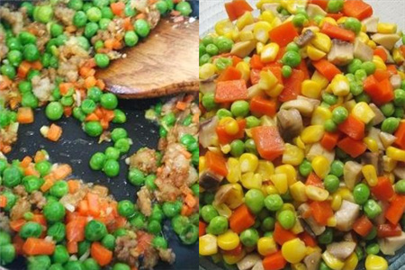 第三步:在锅里煮沸开水,然后把豌豆、胡萝卜粒和玉米粒倒入锅里,片刻后煮熟捞起,放在一旁备用。