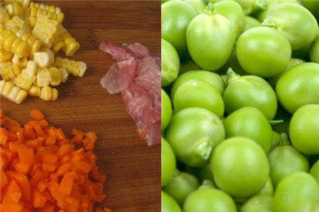 首先,我们准备好做这道菜的食材,分别有玉米、胡萝卜、豌豆还有瘦肉。我们将玉米粒和豌豆剥下来,把胡萝卜和瘦肉切成丁。