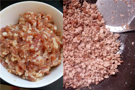 第四步:我们在炒锅里放入适量的油,冒热气了就将肉碎倒入锅里,煸炒出香味。