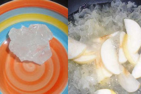 接下来把雪梨切成块状,沥干放置在一边。把冰糖放入锅中,加水煮沸,直至冰糖融化,加入银耳煮五分钟,再加入雪梨和枸杞,同样是煮五分钟,记住,煮的时间不能太长,不然会太烂了不好喝,这样,一道雪梨银耳汤就做好了。
