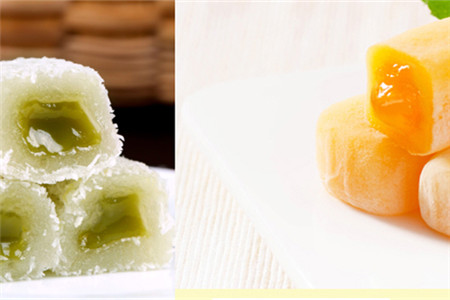 麻薯表皮松软香甜,略带粘性。主要是由糯米粉与玉米淀粉或木薯粉混合做成。