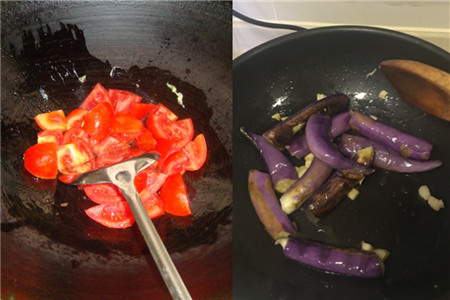 准备好食材之后,把茄子剥皮,然后切成块状放入盘子中,再把西红柿切成片状。把香油放入锅中炒热之后就可以先把茄子放入锅中翻炒几分钟,直至茄子的表皮发皱变黄后,再加入几个大蒜,这样可以使这道菜闻起来很香,翻炒几下之后就放入西红柿,然后加入料酒盐糖等之前准备好的调味品。