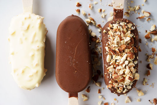 再将冰棍放到巧克力中,使其表面均匀的沾上巧克力。另外,可以在巧克力上面撒上一些花生碎,吃起来更香更有口感哦。