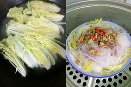 3、把娃娃菜洗净,对半切开再掰成几大片。在锅中加入适量的水,水开沸腾后,把娃娃菜倒入其中焯一遍。但是要注意时间的把握,以防娃娃菜焯得太熟。把焯好的娃娃菜依次码在盘子中,把泡好的粉丝放在娃娃菜上。