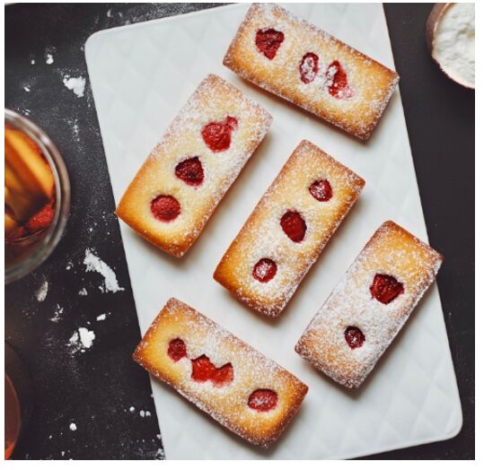 6. 每个费南雪上面放2-3个树莓,放入烤箱中层烤约25-30分钟至表面焦黄,出炉后脱模、放凉,撒上糖粉分量外装即可。