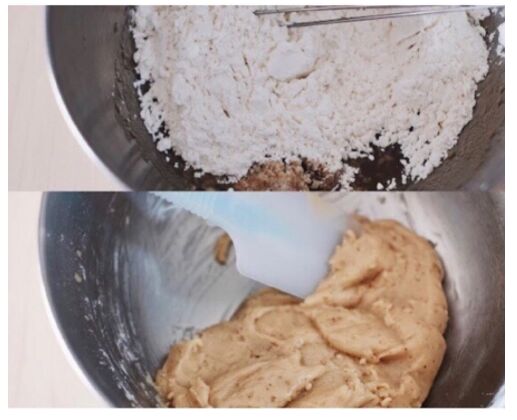 4. 加入融化的黄油、大杏仁粉、糖粉和中粉,稍微搅拌直至混合均匀,不要画圈;