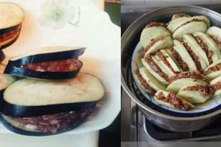 3、把茄子洗净切去头部,将处理好的茄子切成底部相连的两片,就像一个张开的口袋一样。在每一个茄盒中都塞上肉馅,塞好后依次按顺序码在盘中。