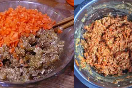 2、将刚买回来的新鲜的猪肉剁成肉馅,如果你觉得自己剁肉馅太麻烦,不妨直接从超市买现成的已经剁好的瘦肉馅。把胡萝卜去皮,用刀切成细末状,与猪肉馅均匀搅拌。在胡萝卜猪肉馅里逐一加入生抽、蚝油、姜末、蒜末、盐、料酒,用筷子充分搅拌使其入味。搅拌的时候一定要顺着一个方向进行,这样才能把食材搅拌均匀。