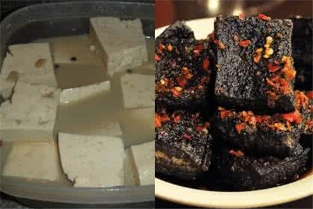 15天以后,将豆腐一块一块的放入卤水中,要求卤水要浸没豆腐。浸泡的时间大概是十多天,浸泡好的臭豆腐呈现黑绿色,并且卤水散发着一股浓浓的臭味。