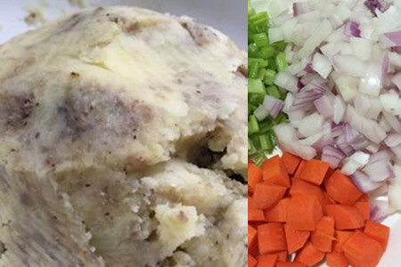 接下来,我们需要将蒸好的土豆取出来并放入盆中,同时再用叉子或者勺子将它碾压成土豆泥。除此之外,我们还需准备一些其他的食材,比如洋葱、玉米罐头和胡萝卜等。