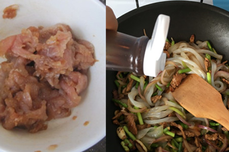 先用开水将河粉泡一下,然后将洋葱和猪肉都需要洗干净,切成细丝状,还需要准备一些辣椒和香葱。先将猪肉放进油锅里面炒熟盛出来。锅里面继续倒入一些油,将洋葱和青辣椒放进去翻炒熟,加入之前准备好的猪肉一起炒。
