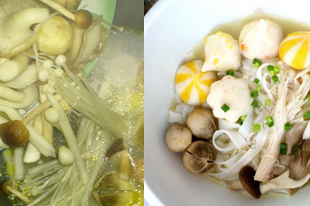 食材:河粉600克、什锦蘑菇250克、什锦肉丸250克、土豆1个、鸡肉300克、姜、葱、盐。