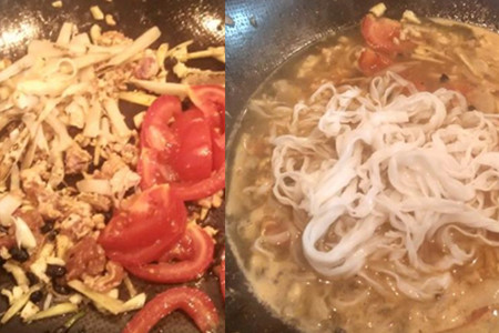 把挤干水分的酸笋放入锅中,不需倒油,开大火,将酸笋的水分炒干,盛出锅待用。锅先不放油,直接下豆豉、姜丝和蒜末炒香,倒入适量食用油,加入腌渍好的猪肉末,翻炒几下,放入西红柿块和酸笋条一起翻炒几分钟,炒得越久越香。往锅里倒入已经烧开的高汤,下河粉,熄火,搅匀即可盛出锅,撒上一些葱末即可。