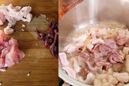 姜切末,葱切末。猪肝洗净切小块。猪肉用水洗净,把肥肉和瘦肉切开,各自切小块。肥肉直接下锅,煸出肥油,放入瘦肉和猪肝翻炒。