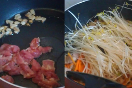 肥肉直接下锅,开中小火煸出肥油。肥油煸出后,拨到一边,放入腌渍好的瘦肉,翻炒一会,加入胡萝卜丝、葱白和大蒜末炒香,然后放入滤干水分的豆芽,翻炒均匀。食材炒至七成熟后,加入适量食盐调味,盛出锅待用。
