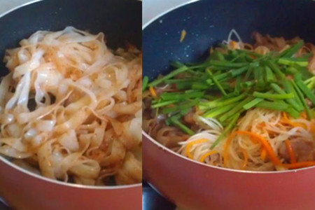 食材:河粉500克、猪肉100克、胡萝卜3根、豆芽100克、大蒜、小葱、白糖、蚝油、老抽、盐、油。