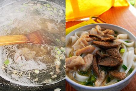 炒至七成熟后,倒入适量清水,加入食盐和鸡精,大火烧开,盛出锅,撒入葱花即可。另外拿一个锅,倒入适量小半锅清水,大火煮开,放入河粉烫一分钟,捞出锅滤干水分,装入碗中,浇上煮好的猪肝瘦肉汤即可食用。【女物原创未经允许,谢绝转载!】