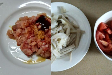 猪肉末用料酒、蚝油、生抽和少许食用油腌渍二十分钟。酸笋切成细条,用清水泡上半小时,挤干水分待用。西红柿用清水洗净切小块,生姜切丝,大蒜切末,小葱切碎。