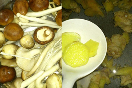 什锦蘑菇清洗干净,鸡肉洗净剁成小块,土豆削皮切小方块,生姜切片。在锅里加入适量清水,煮开,下鸡肉块,烫至没有血色,捞出锅,滤干水分。
