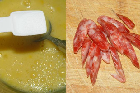 准备一个大碗,打入鸡蛋,加一勺玉米面粉,少许食盐和少许清水,搅拌成没有颗粒物的面糊。大蒜切片,香肠切片,金针菇剪掉根部,洗净待用。