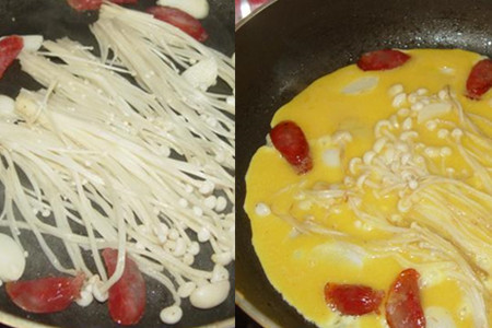 金针菇不需要煎过久,所以先将香肠片和大蒜片下锅,再放入金针菇。鸡蛋液中加玉米面粉,可以使煎出的蛋饼颜色更好看,如果家里没有玉米面粉,可以用普通面粉代替。蛋饼煎至定型,四周微微翘起,再翻面,否则会把蛋饼弄碎。