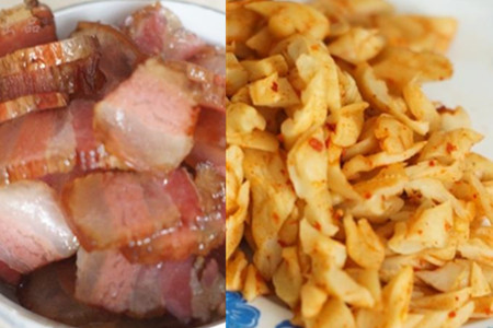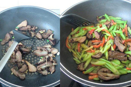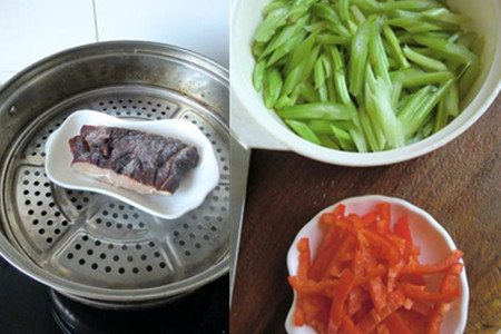 腊肉提前蒸熟再炒制,不仅可以去掉一些油脂,还能使腊肉口感更香。芹菜放入开水中烫,并在开水里加少许食盐,烫好后快速放入凉水过凉,可以使芹菜保持翠绿。【女物原创未经允许,谢绝转载!】