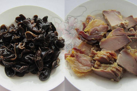 食材:干黑木耳30克、胡萝卜50克、腊肉200克、青椒50克、蒜苗50克、姜、生抽、鸡精、盐、植物油。