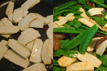 热锅凉油,下豆干煎炒几分钟,放入雪豆和腊肉片,加适量食盐,大火翻炒,把雪豆炒熟即可盛出锅。做这道菜先将腊肉提前蒸熟,再放入锅里炒制,这样炒出的腊肉就不会太干。