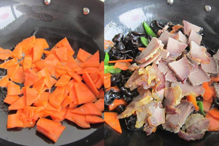 干木耳用温水浸泡可以节约时间。先将木耳和胡萝卜下锅炒制,并加盐翻炒,这样炒腊肉的时候就不需要再加盐。