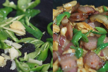干木耳放入温水里泡半小时,剪掉蒂部,切成小块。腊肉用清水泡三个小时左右,再放入蒸锅里蒸半小时,然后取出晾凉,切片待用。胡萝卜用清水洗干净,削皮切成菱形片。生姜切末,蒜苗切段,青椒洗净切段。
