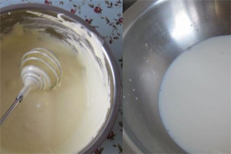 将鸡蛋和白糖用打蛋器打发,打发到颜色变成奶白色即可。慢慢的将牛奶倒入打发的鸡蛋中去。