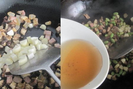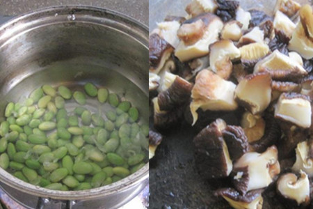 食材:腊肉50克、毛豆仁100克、干香菇30克、茭白30克、料酒、盐、油。