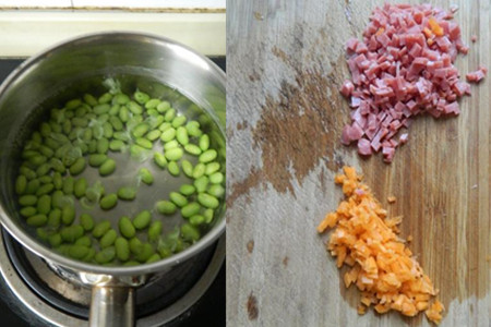 毛豆用水清洗干净,冷水下锅,加少许食盐,大火烧开,再煮三分钟,捞出锅,滤干水分。胡萝卜用水洗净,切碎。烤肠剁碎。