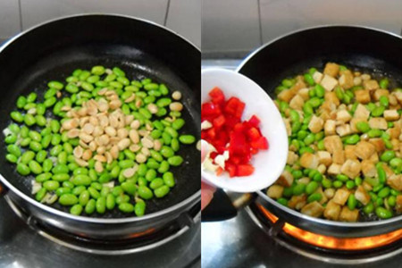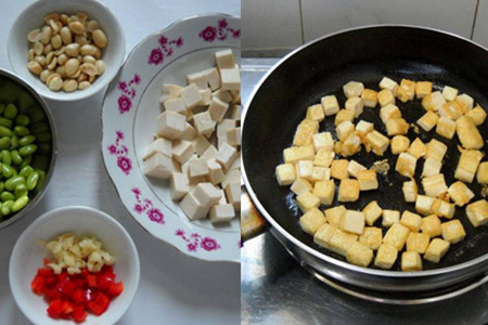豆腐切成小块,毛豆剥壳取出豆粒,花生用清水浸泡去掉红衣,大蒜切碎,红尖椒切段。热锅凉油,下豆腐块煎制,把豆腐两面都煎成酥黄,盛出锅待用。