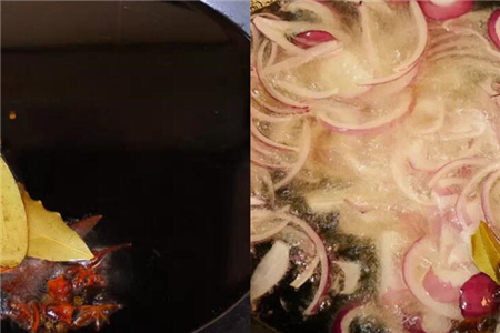 将洋葱切成细丝,葱切成长段。在锅中倒入食用油,把所有的香料加入油锅中,开中火加热(火大容易将香料烧焦)。一般需要熬制30分钟左右,这个时候香料的香味已经基本融入到油里去了。将洋葱丝倒入锅中,转小火熬制。
