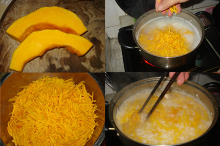 2、锅中加适量的水大火烧开,加入大米,煮开后再小火煮十五分钟,把大米煮得大概七成熟。加入南瓜丝或丁,再煮十分钟,放盐调味,吃前撒入葱粒或胡椒粉提香。